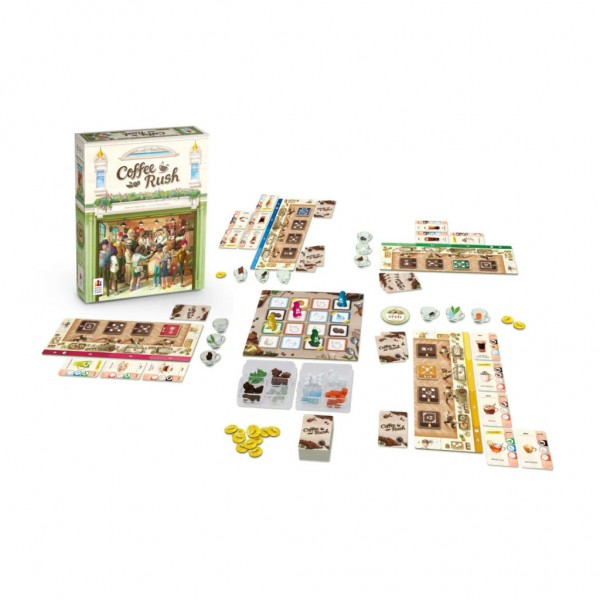 1 plateau Ingrédients, 4 plateaux joueur, 16 tuiles Amélioration, 6 Meeples, 80 cartes Commande, 2 bacs à Ingrédients, 102 pions Ingrédient, 15 pions Rush, 12 tuiles Tasse, 1 jeton premier joueur, 1 règle.