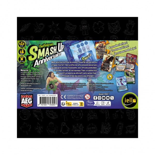 Smash Up, le célèbre jeu d'affrontement qui fête ses 10 ans ! Même après plus de 10 ans de combats, Smash Up parvient encore à frapper très fort ! Alors profitez de cette extension anniversaire qui regorge de surprises fracassantes, pour votre plus grand plaisir.