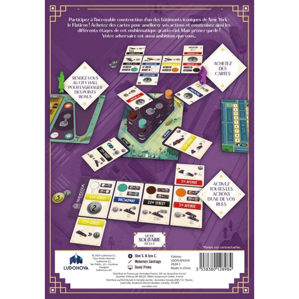 Participez à la construction du bâtiment emblématique de la grosse pomme, Le FLATIRON. Face à votre adversaire soyez le premier dans des taches de construction, à maintenir une image publique propre et à adhérer aux décrets du CM de N.Y.